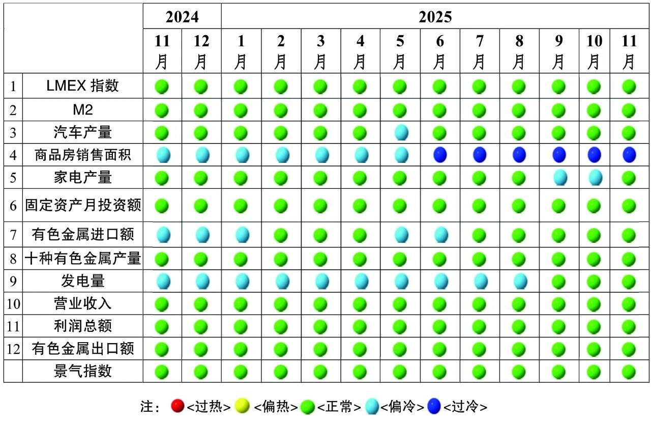 在构成有色金属产业景气指数的12项指标中,LMEX指数、M2、汽车产量、家电产量、有色金属固定资产月投资额、有色金属进口额、十种常用有色金属产量、发电量、营业收入、利润总额及有色金属出口额等11项指标位于“正常”区间,仅商品房销售面积1项指标位于“过冷”区间。